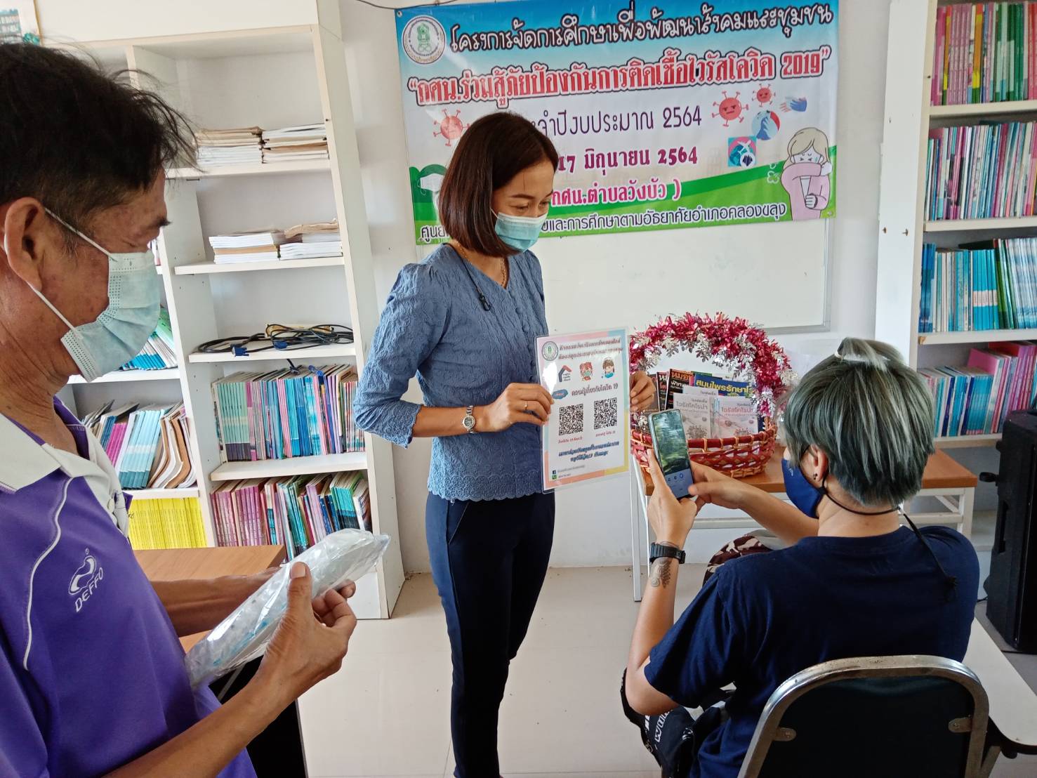 วันที่ 18 มิถุนายน 2564 นางสาวสะสิณา จันทร์มณี บรรณารักษ์ห้องสมุดประชาชนอำเภอคลองขลุง ได้นำกิจกรรมส่งเสริมการอ่านไปร่วมโครงการจัดการศึกษาเพื่อพัฒนาสังคมแลุะชุมชน "กศน.ร่วมสู้ภัยป้องกันการติดเชื้อไวรัสโควิด 2019 ประจำปีงบประมาณ 2564" โดยได้นำหนังสือความรู้เกี่ยวกับการป้องกันโควิด 19 และประชาสัมพันธ์กิจกรรมส่งเสริมการอ่านผ่านสื่อออนไลน์ สแกนคิวอาร์โคด ความรู้เกี่ยวกับโควิด 19 ณ พื้นที่ ตำบลวังบัว, ตำบลท่าพุทรา, ตำบลวังยาง, ตำบลวังแขม, ตำบลแม่ลาด