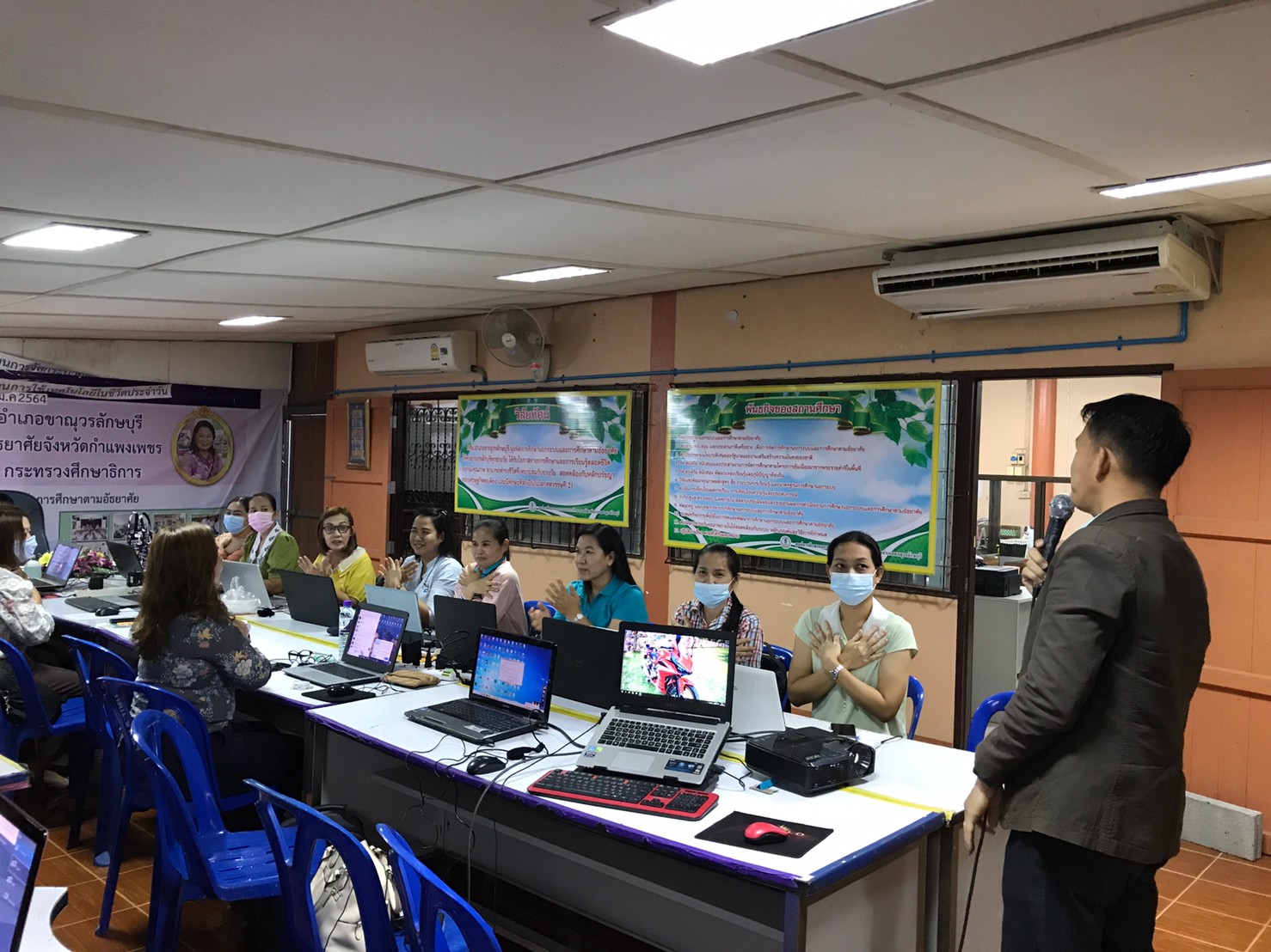 เมือวันที่ 27 มกราคม 2564 นางสาวพันธิภา ประวาสุข ผู้อำนวยการ กศน.อำเภอขาณุวรลักษบุรี ให้เข้าร่วมทบทวนการจัดกระบวนการเรียนรู้ด้วยระบบออนไลน์ กับคณะบุคลากร กศน.อำเภอขาณุวรลักษบุรีและ กศน.อำเภอบึงสามัคดี โดยมีนายวิวัฒน์ แสงพุ่ม ครู กศน.ตำบล เป็นวิทยากรให้ความรู้ เริ่มจากการร่วมกันทำแบบทดสอบก่อนเรียน อธิบายการทำเว็บไซต์เผยแพร่แบบเรียนออนไลน์ของ กศน.ตำบล โดยทำฝึกทำใน Google sites ฝึกทำและตกแต่งหน้าเว็บ การอัปโหลดข้อมูลเก็บไว้ในเว็บไซต์ ทำการเผยแพร่เว็บไซต์แบบ QR Code การทำแบบทดสอบก่อนเรียน-หลังเรียน จากโปรแกรม Google from การออกแบบวุฒิบัตรจากโปรแกรม Adobe Photoshop Google slides พร้อมทั้งฝึกทำแบบทดสอบเพื่อการออกวุฒิบัตรที่ถูกต้องสวยงาม วิทยากรสรุปการออกแบบเว็บการทำหลัก การเพิ่มหน้าย่อย การเสริมเพิ่มเติมข้อมูลให้สมบูรณ์ในภายหลัง อีกทั้งทำแบบทดสอบหลังเรียนให้ได้คะแนนไม่ต่ำกว่าร้อยละ 80 เพื่อรับวุฒิบัตรผ่านการอบรมการจัดกระบวนการเรียนรู้ด้วยระบบออนไลน์ในวันนี้