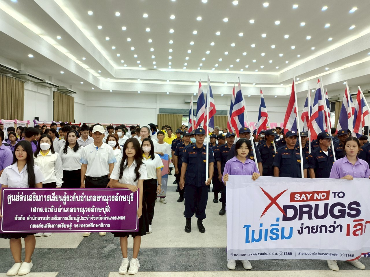 นางจรรณญากร โฉมงาน ครู รักษาการในตำแหน่ง ผู้อำนวยการศูนย์ส่งเสริมการเรียนรู้ระดับอำเภอขาณุวรลักษบุรี นำบุคลากรและนักศึกษา สกร.ระดับอำเภอขาณุวรลักษบุรี เข้าร่วมกิจกรรมรณรงค์ประชาสัมพันธ์ เสริมสร้างความแข็งแรง เพื่อเอาชนะยาเสพติดอย่างยั่งยืนเนื่องในวันต่อต้านยาเสพติดโลก (26 มิถุนายน) ประจำปีงบประมาณ พ.ศ.2568 โดยมีกิจกรรมเดินรณรงค์ต่อต้านภัยยาเสพติด บันทีกข้อตกลงความร่วมมือ (MOU) “การป้องกันและแก้ไขปัญหายาเสพติด” นำเสนอผลการดำเนินโครงการ TO BE NUMBER ONE และการแสดง TO BE NUMBER ONE ณ หอประชุมเฉลิมพระเกียรติ 80 พรรษา อำเภอขาณุวรลักษบุรี จังหวัดกำแพงเพชร