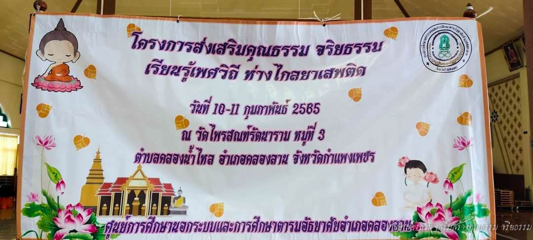 วันที่ 10-11 กุมภาพันธ์ 2565 นายรามินทร์ มูลไธสง ครู รักษาการในตำแหน่งผู้อำนวยการ กศน.อำเภอคลองลาน จัดกิจกรรมพัฒนาคุณภาพผู้เรียนตามนโยบายการจัดการศึกษานอกระบบระดับการศึกษาขั้นพื้นฐาน โครงการส่งเสริมคุณธรรม จริยธรรม เรียนรู้เพศวิถี ห่างไกลยาเสพติด ณ วัดไพรสณฑ์รัตนาราม หมู่ที่ 3 ตำบลคลองน้ำไหล อำเภอคลองลาน จังหวัดกำแพงเพชร มีการแนวแนวการศึกษาต่อระดับปริญาตรี จากคณะวิทยาการจัดการ และคณะเทคโนโลยี มหาวิทยาลัยราชภัฎกำแพงเพชร