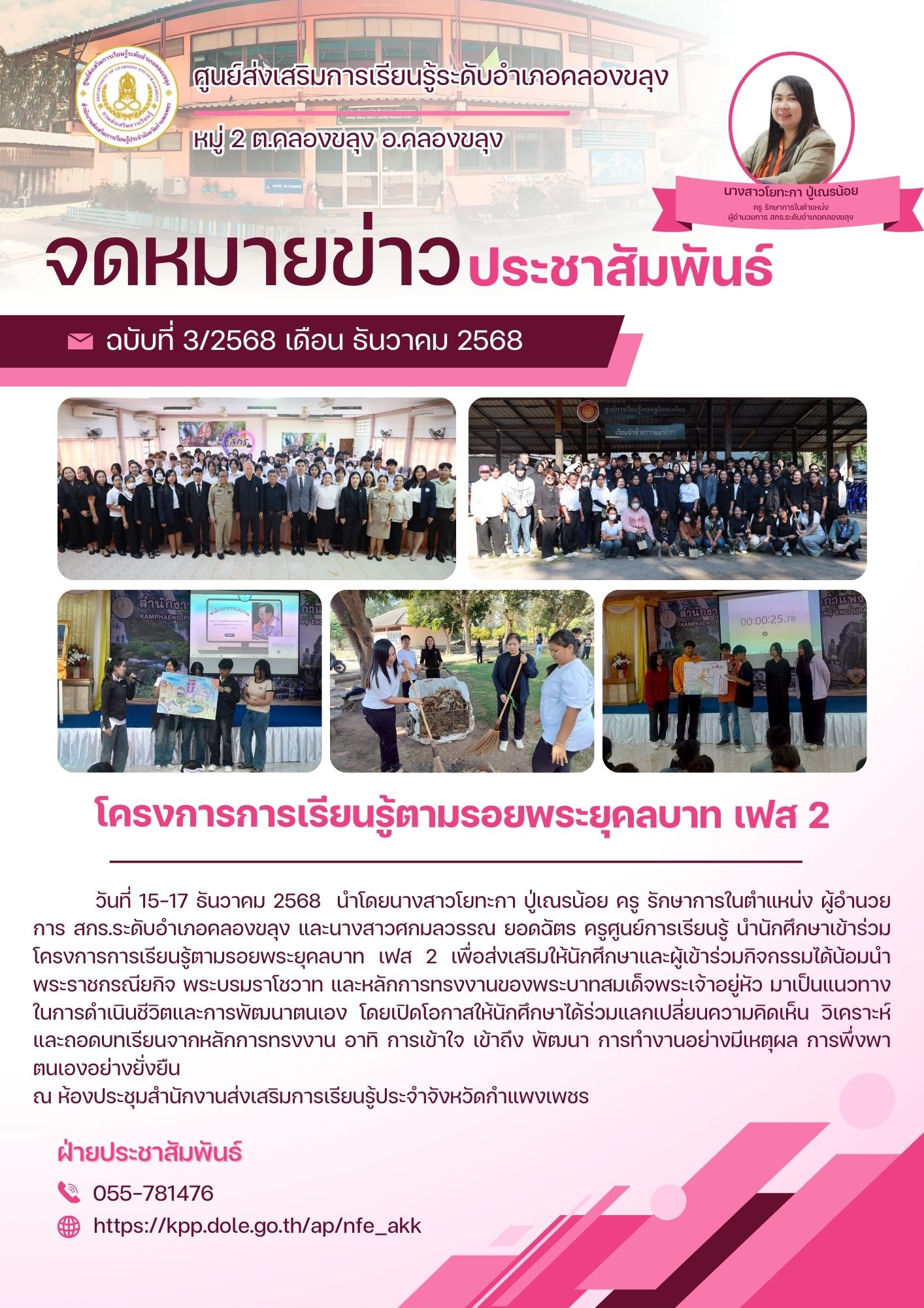 วันที่ 15-17 ธันวาคม 2568 นำโดยนางสาวโยทะกา ปู่เณรน้อย ครู รักษาการในตำแหน่ง ผู้อำนวยการ สกร.ระดับอำเภอคลองขลุง และนางสาวศกมลวรรณ ยอดฉัตร ครูศูนย์การเรียนรู้ นำนักศึกษาเข้าร่วมโครงการการเรียนรู้ตามรอยพระยุคลบาท เฟส 2 เพื่อส่งเสริมให้นักศึกษาและผู้เข้าร่วมกิจกรรมได้น้อมนำพระราชกรณียกิจ พระบรมราโชวาท และหลักการทรงงานของพระบาทสมเด็จพระเจ้าอยู่หัว มาเป็นแนวทางในการดำเนินชีวิตและการพัฒนาตนเอง โดยเปิดโอกาสให้นักศึกษาได้ร่วมแลกเปลี่ยนความคิดเห็น วิเคราะห์ และถอดบทเรียนจากหลักการทรงงาน อาทิ การเข้าใจ เข้าถึง พัฒนา การทำงานอย่างมีเหตุผล การพึ่งพาตนเองอย่างยั่งยืน