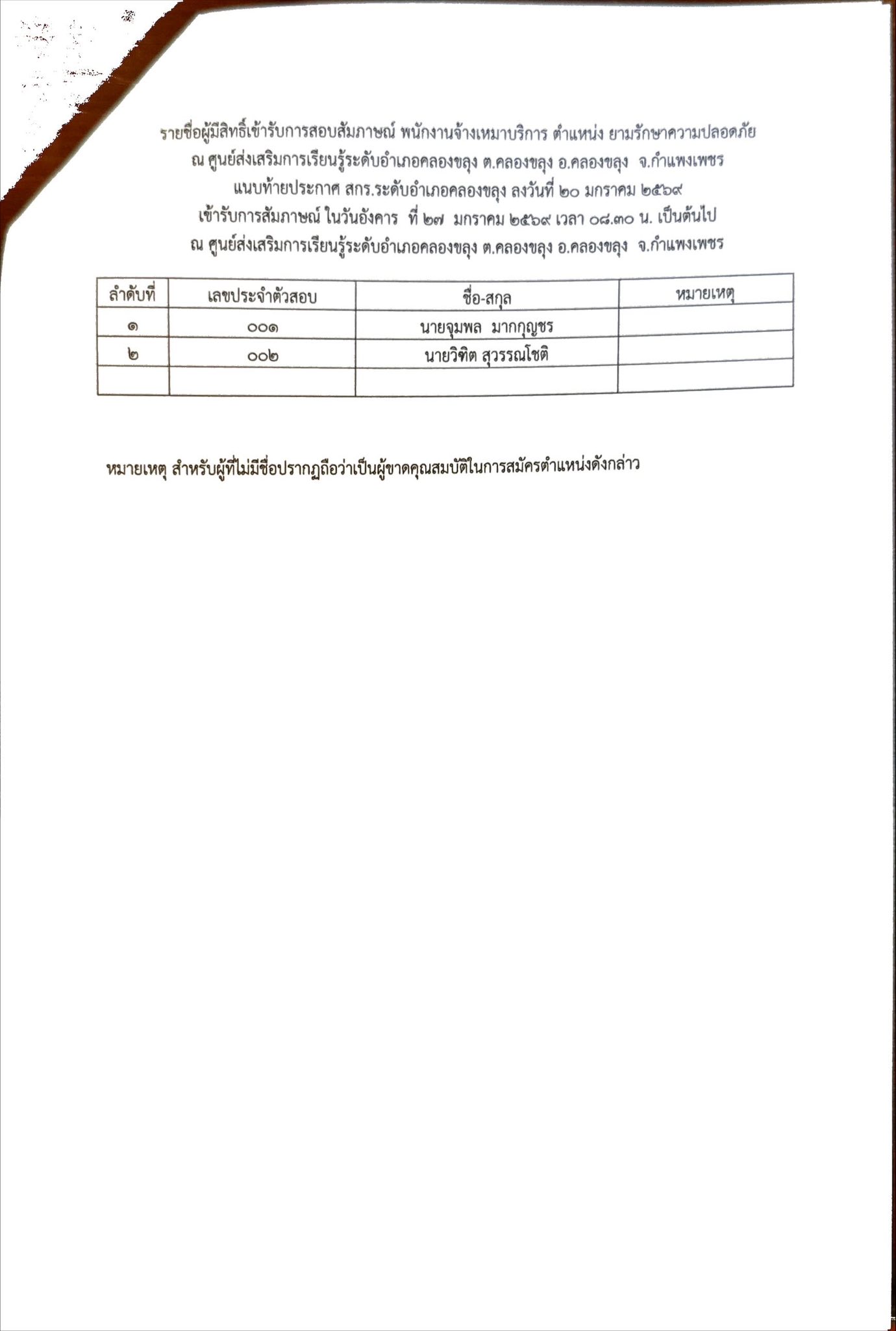 ประกาศรายชื่อผู้มีสิทธิ์เข้ารับการสอบสัมภาษณ์ เป็นพนักงานจ้างเหมาบริการ ตำแหน่ง ยามรักษาความปลอดภัย