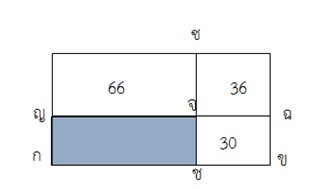 รูปสี่เหลี่ยมผืนผ้า กขคง แบ่งเป็นสี่ส่วน มีพื้นที่เป็น ตารางหน่วยตามที่กำหนดดังรูป โดยที่ จฉคซ เป็นรูปสี่เหลี่ยมจัตุรัส รูปสี่เหลี่ยม กชจญ มีพื้นที่กี่ตารางหน่วย |