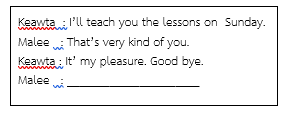 เลือกคำพูดที่เหมาะสมที่สุดกับบทสนทนาที่กำหนดให้ Miss Suda : See you later. Mr.Tom : __________.  |