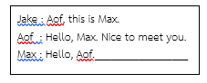 เลือกคำพูดที่เหมาะสมที่สุดกับบทสนทนาที่กำหนดให้ Miss Cathy : Give my regards to Mr. A.J. Miss Suda : ____________________ |